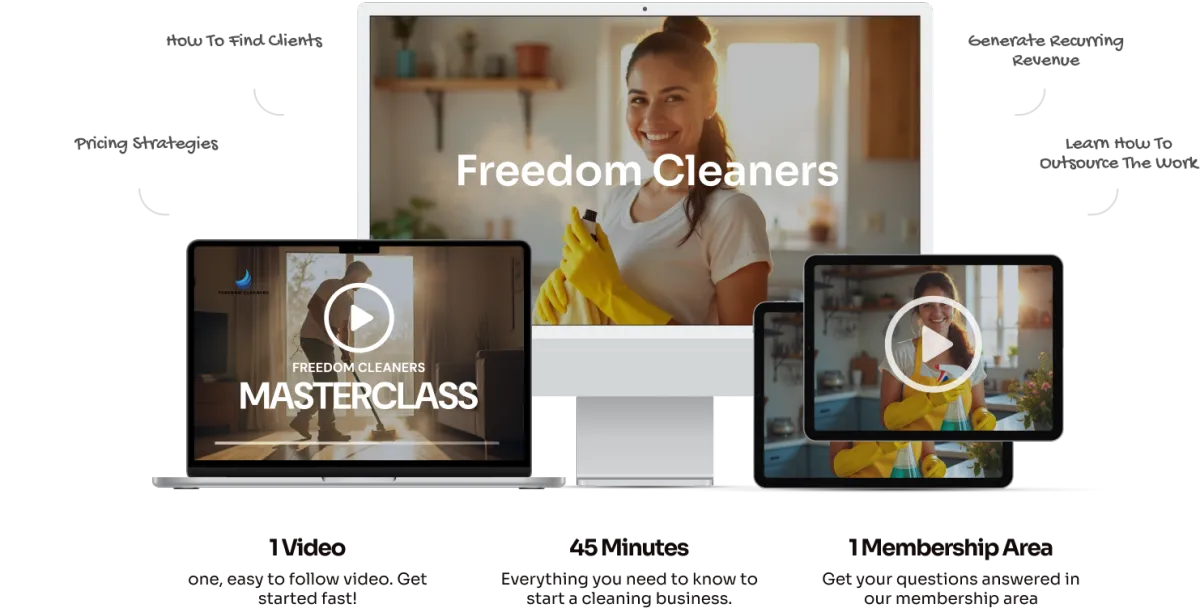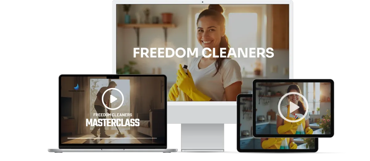 You are getting access to the Freedom Cleaners Blueprint masterclass, available instantly. You are getting access to an exclusive members area where you can ask questions and get answers from us directly.